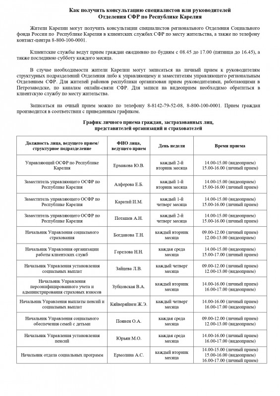 Как получить консультацию специалистов или руководителей Отделения СФР по Республике Карелия